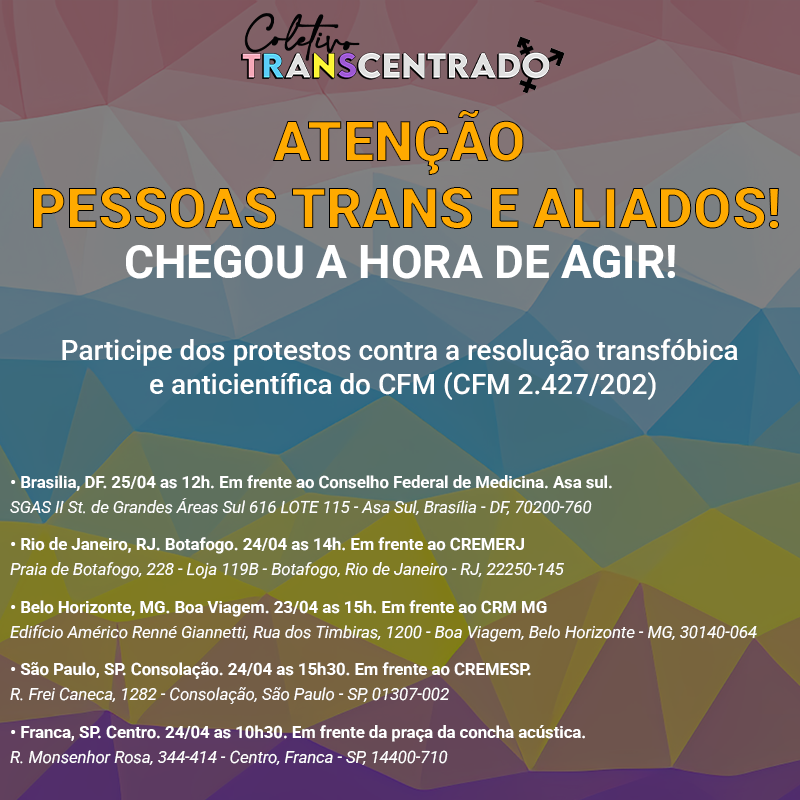 O Coletivo Transcentrado convoca todas as pessoas trans, não bináries, travestis, LGBT+s e aliadas de todas as regiões do Brasil a se unirem em protesto contra a resolução transfóbica e anticientífica do Conselho Federal de Medicina (CFM 2.427/2022).